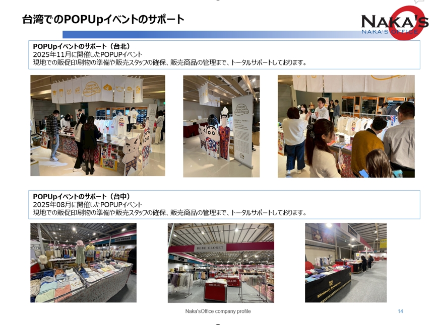 例えば、日本のナチュラルコスメブランドが、台湾でリサーチを実施。台湾の20〜30代女性の肌悩み/トレンド感をヒアリングし、台湾限定パッケージを開発。台湾ECモールに出店し、初年度は越境モデルで展開、次年度には台北にポップアップ店舗を開設。通訳・翻訳・物流・現地PRをナカズオフィスが支援、検品・出荷・倉庫代行も組み込む…というような成功パターンが現実的です。